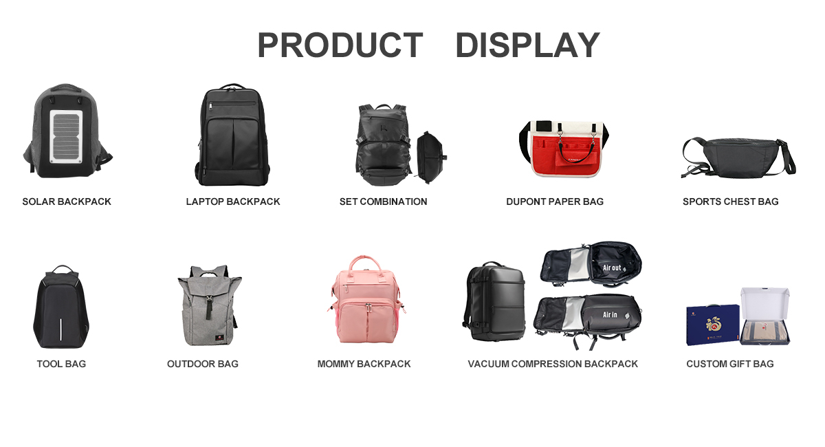 Productos principales:Mochila, bolsa de ordenador portátil, bolsa de herramientas, bolsa de exterior, bolsa de regalo